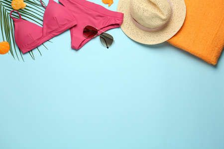 Female summer swimsuit, clothes and accessories collection on blue. Flat lay, top view