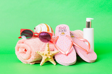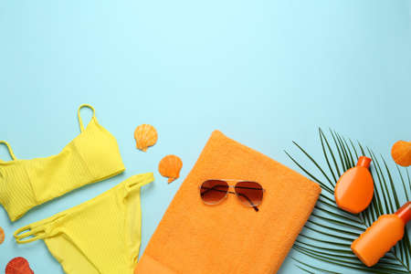 Beach accessories. Various creams, glasses, hat and towel with sea shells on a colored background. Top view. Flat Lay.