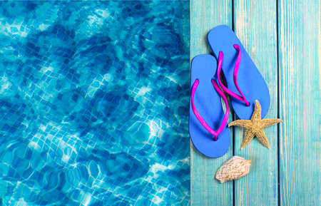 Swimming pool shoes thongs flip flops towel and shell starfish