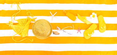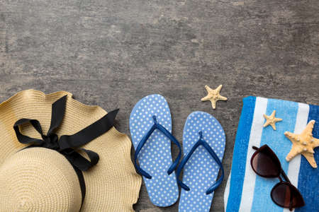 Summer vacation concept flat lay. beach accessories and towel top view. Space for text. travel concept.