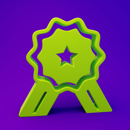 Green Medal with star icon isolated on purple-blue background. Winner achievement sign. Award medal. Minimalism concept. 3D render illustration.