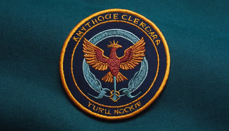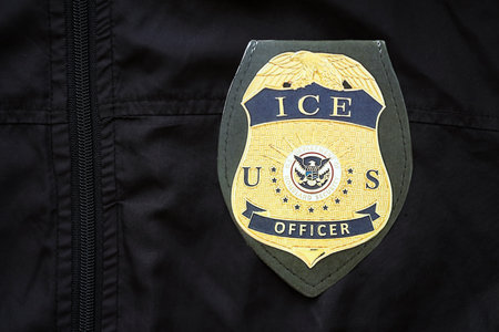 KYIV, UKRAINE - SEPTEMBER 17, 2025 US ICE Officer badge on black uniform fabric surface close up