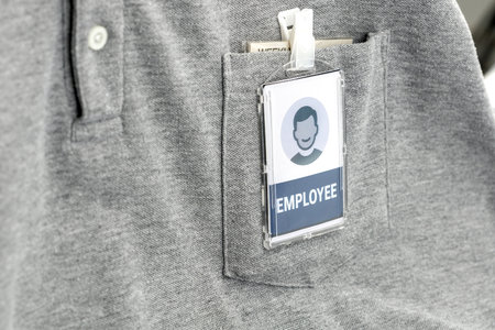 A gray shirt with employee badge clipped to pocket, featuring generic icon and word employee prominently displayed. badge is clear and professional
