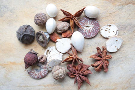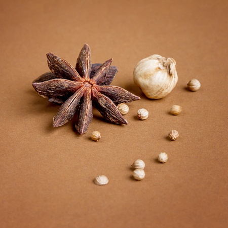 edible herbal spice of star anise, coriander seed, garlic closeup studio shot