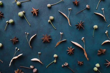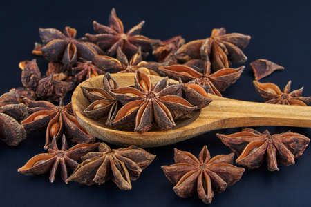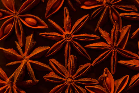 Chinese star anise close up background. Dried star anise spice fruits top view.