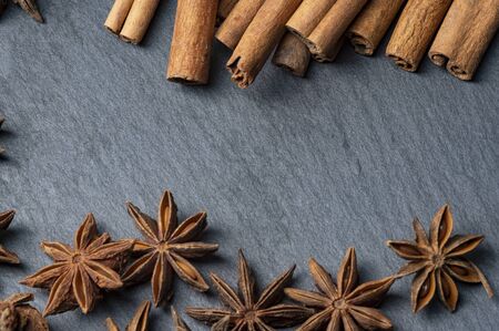 Traditional Christmas spices - Star anise with cinnamon on a dark background.