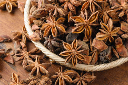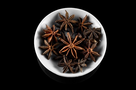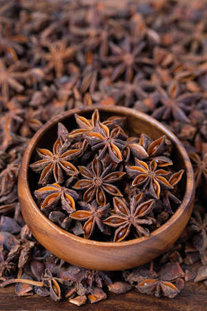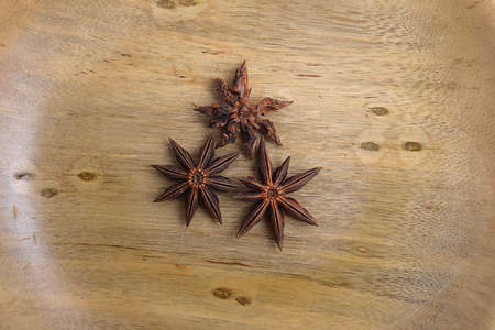 Star anise star-anise Christmas spice herb from above bowl on a wooden board wood