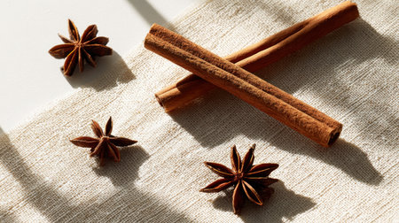 This image showcases cinnamon sticks and star anise spices, artfully arranged on a textured, light-colored linen surface. The composition benefits from soft, natural lighting, creating subtle shadows and highlights. Suitable for culinary, lifestyle, or decorative projects. It is a visually appealing image with potential commercial applications.