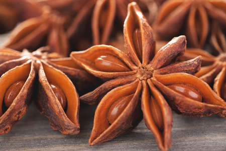 Star anise with seeds on a wooden table closeup macro shot, selective focus