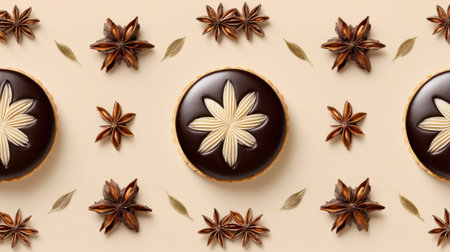 A stunning chocolate cake featuring an elegant floral design at its top, beautifully complemented by star anise and leaves, perfect for food lovers and celebrations.