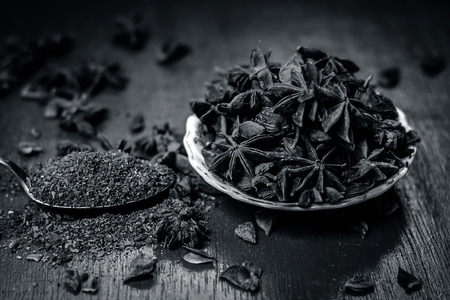 Close up of star aniseed,Illicium verum in a plate with its powder.