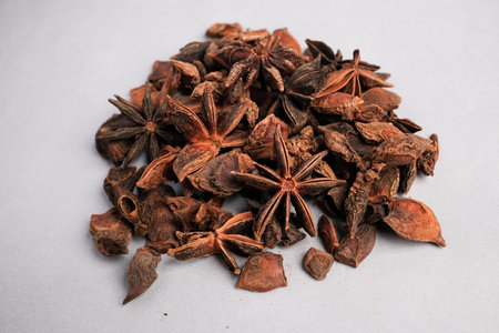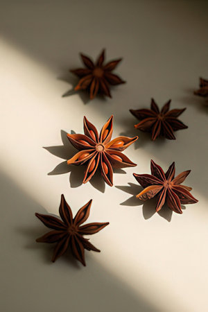 Dried star anise scattered on a bamboo mat creating a natural aromatic spice background ideal for culinary and food concepts