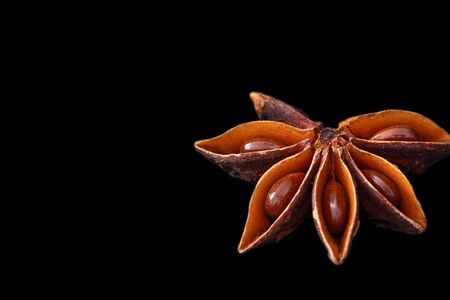 Star anise pod with seeds cooking flavouring spice. Isolated on a black background