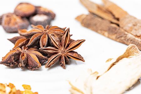 Isolated Chinese dried spice for Asian food as cinnamon stick , Thai Cardamon, Star anise, the image on white background, front view, low angle view.