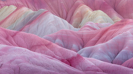 Close-up view of layered, colorful hills exhibiting varied textures and hues of pink, pale red, white, and gray. The surface texture displays a wrinkled, undulating appearance characteristic of geological formations.