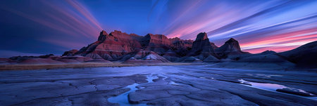 south dakota falls sunset at badlands national park showcases a psychedelic surrealist landscape with vibrant hues of light red and purple. the image captures a striking juxtaposition of hard and soft lines, enhanced by nature-inspired installations. the color palette includes light crimson and beige, creating a mesmerizing effect. this photograph resembles a captivating matte painting with its horizontal stripes and dreamlike ambiance. ai generated