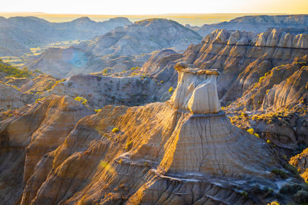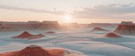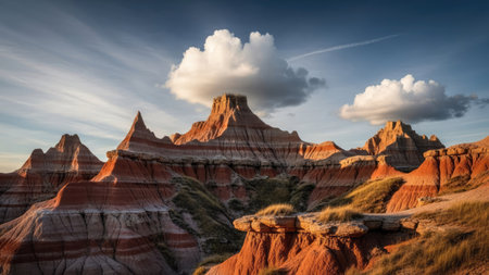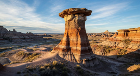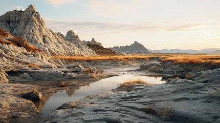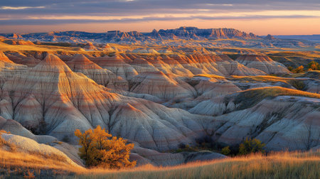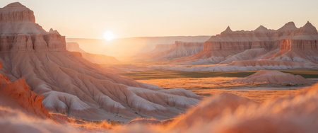 AI Generated. serene magnificence of Badlands at sunrise captures gentle illumination distinctive geological formations and deep bond between land and first rays of sunlight