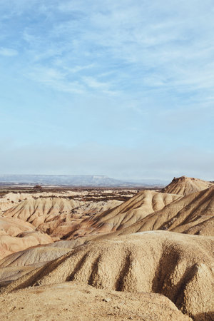 Desert landscape with various abstract geological forms in the Bardenas Reales of Navarra, Spain, on December 26, 2023