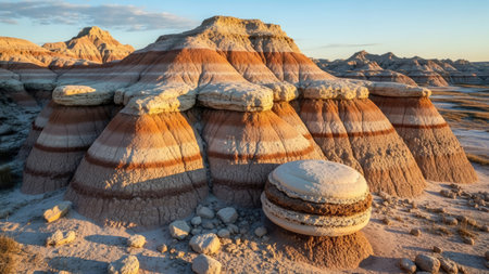 Experience the stunning beauty of the Badlands at sunrise, showcasing colorful rock formations bathed in soft light, revealing nature's exquisite palette and serene landscapes.