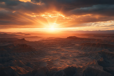 Breathtaking sunset over a vast desert landscape with sun rays illuminating rugged terrain