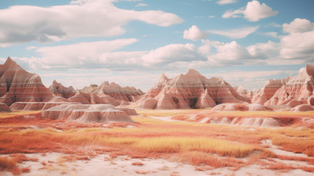 a view of the badlands in western south dakota and idaho, showcasing the whimsical wilderness and hyperrealistic landscapes. the photo, processed in the style of cross-processing, captures the nature-inspired installations by esao andrews. the light crimson and beige hues add a touch of enchantment to the scene, reminiscent of bjarke ingels' architectural designs. ai generated
