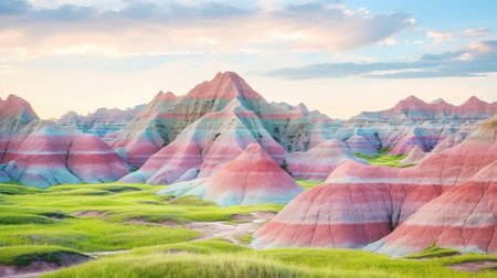 the badlands national park showcases mesmerizing landscapes with vibrant and surreal patterns resembling pastel dreamscapes. this national geographic photo captures the psychedelic-inspired beauty of the park, featuring whimsical and fantastical elements. the colors range from light crimson and green to light magenta and azure, creating a captivating visual experience reminiscent of rural china. ai generated