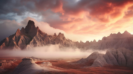 a stunning sunrise over the beautiful badlands, captured in ultra high resolution photography. the mountains are adorned with clouds, creating a mesmerizing scene with godrays piercing through the morning mist. this epic and magical atmosphere is beautifully portrayed in this wide angle shot taken with a hasselblad camera. ai generated