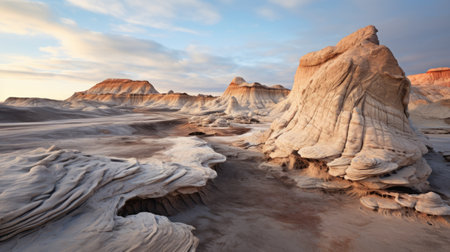 a colorful landscape showcasing the majestic badlands of arizona, captured in the style of organic forms and muted tones. this stunning photograph, reminiscent of the detailed marine views of john wilhelm and the sweeping seascapes of emily carr, features a captivating combination of dark white and light orange hues. shot on fujifilm pro 400h, it beautifully captures the grandeur of the arizona badlands. ai generated