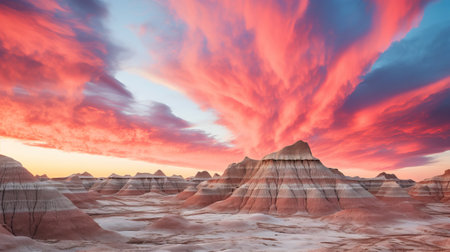 sandstone cliffs in the badlands desert showcase richly colored skies and ethereal cloudscapes. the light red and magenta hues create a mesmerizing display, reminiscent of a national geographic photo. these naturalistic cityscapes feature organic, fluid lines, blending seamlessly with site-specific installations. ai generated