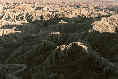 a mesmerizing aerial view of a sandy beach in the badlands, captured in vibrant warm tones. this hyper-realistic photo evokes the breathtaking beauty of the landscape as seen from a drone's perspective. ai generated