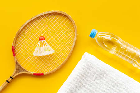 Competitive sports equipment. Two badminton rackets and shuttlecock with towel and water