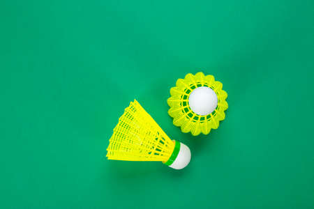 Two shuttlecock for badminton on a green background, top view. The concept of active breathing.