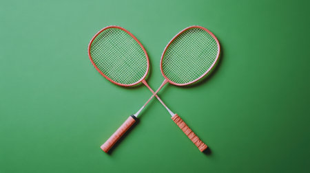 This image features two badminton rackets crossed over a vibrant green background, perfect for sports-related themes or fitness promotions.