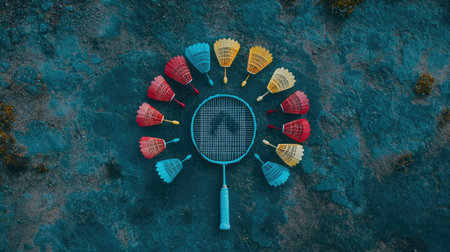 A visually striking flat lay image featuring an array of colorful badminton shuttlecocks arranged in a circular pattern around a racket on a vibrant blue surface.