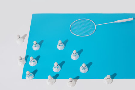 top view of white badminton racket and shuttlecocks on white background