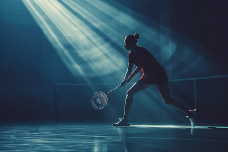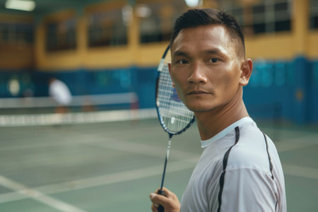Focused badminton player on indoor court with racket in hand for sports enthusiasts