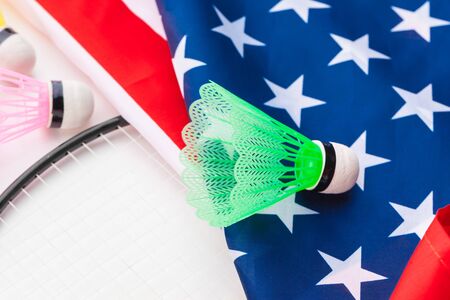 Badminton racket and shuttlecocks on USA national flag. creative photo.