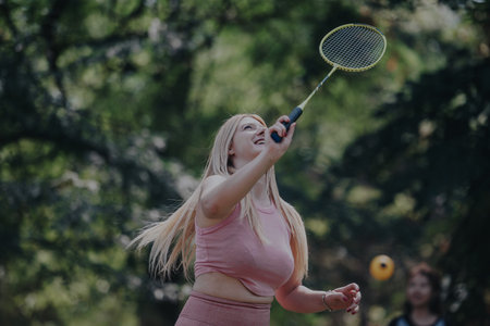 A young woman is demonstrating her badminton technique, holding a racket with determination and a smile.