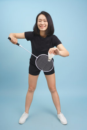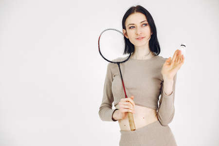 Pretty mulatto girl standing with badminton accessories in the studio looking at the camera