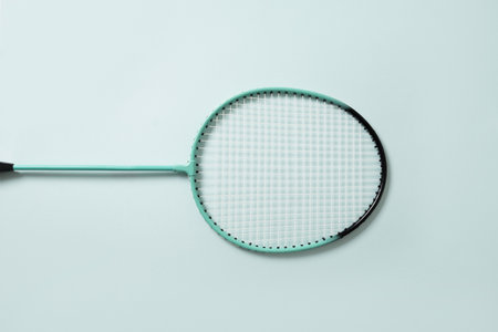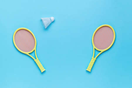Badminton racket on blue background. Concept racket sport. Leisure games. Top view.