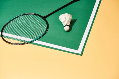 Bright yellow badminton shuttlecock and racket with natural light shading on green background at outdoors badminton court, blurred badminton background, copy space.