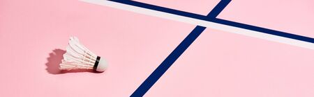 Shuttlecock for badminton on pink surface with blue lines, panoramic shot