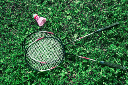 Shuttlecocks with badminton racket on green grass