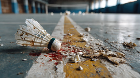 A broken shuttlecock lies abandoned on a dirty sports court floor, surrounded by scattered debris and blood stains, creating a disturbing atmosphere.