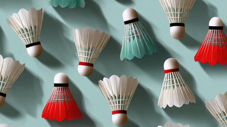 A collection of colorful badminton shuttlecocks is showcased against a soothing turquoise background, creating an energetic and vibrant visual perfect for sports-related themes.
