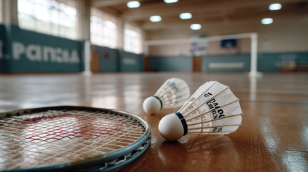 Close-up view of badminton equipment on a wooden court, showcasing rackets and shuttlecocks in a vibrant gym environment ideal for sports activities.