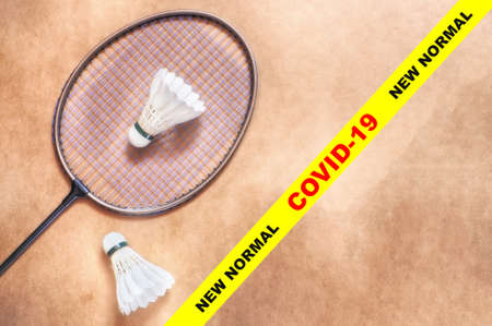 Covid-19 and new normal words on yellow line with badminton racket and shuttlecock on isolated background. Coronavirus disease 2019 or Covid-19 protect yourself concept