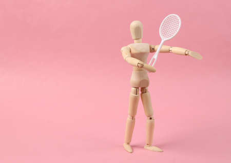 Wooden puppet with tennis racket on pink background