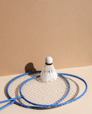 Badbintion racket with a shuttlecock on a beige background with a shadow. creative layout