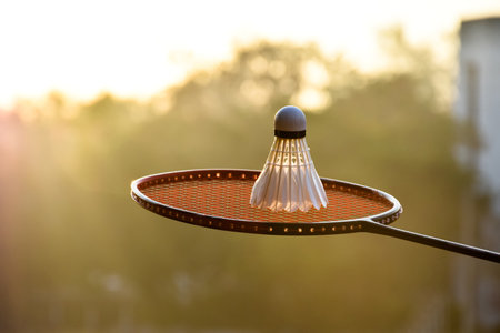 New badminton shuttlecock on the badminton racket, blurred outdoor background. concept for badminton lovers around the world.